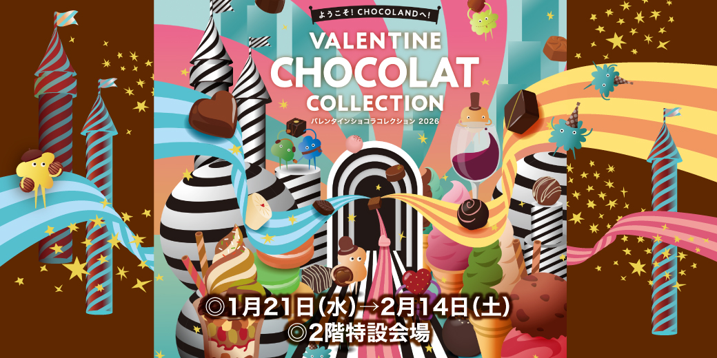 1月21日(水)→2月14日(土)の期間、2階特設「バレンタイン ショコラ コレクション」会場で、一勘定1,000円(税込)以上お買いあげいただくと、5階レストラン〈ロビーガーデン by スカイテラス〉でお食事の際にご利用いただける近鉄百貨店アプリ会員さま限定「バレンタイン特別200円分デジタルクーポン」をアプリで配信!