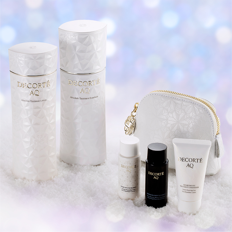 コスメデコルテのラグジュアリーライン「AQ」のスキンケアはもちろん、ヘアケアまで試せるキットが登場。ツヤ、弾力感を叶える「アブソリュート」ラインまたは、明るさあふれる肌に導く「アブソリュート ブライト」ラインから、肌状態に合わせて選んだエマルジョン(現品)とローション(現品)に、美しい髪を育むヘアケア3アイテムとポーチをセット。肌から髪まで美しさをまとう冬の日々が始まります。