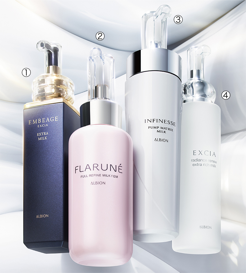 “洗顔後、まず乳液をなじませて角層のうるおいバランスを整える”というアルビオン独自のスキンケアメソッドから生まれた“先行乳液”をご紹介。最高峰*¹のエイジングケア*²乳液「エクシア アンベアージュ エクストラミルク」、乾燥によるくすみをケアする「フラルネ フルリファイン ミルク f M/EM」、引き締まったハリ肌に導く「アンフィネス パンプ マトリクス ミルク」、ワンランク上*¹の浸透感*³「エクシア ラディアンスリニュー リッチミルク/エクストラリッチミルク」。この4種から年代や好みのテクスチャー&香りで選んで、アルビオンならではのうるおい体験を。