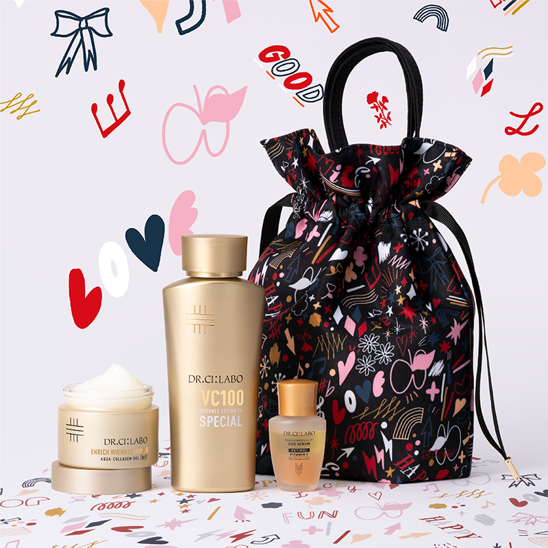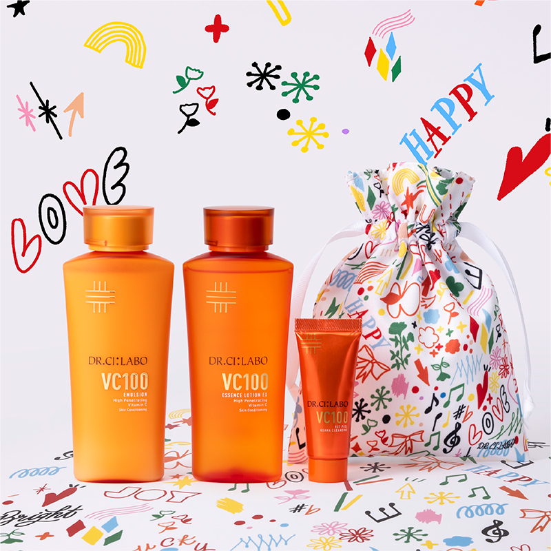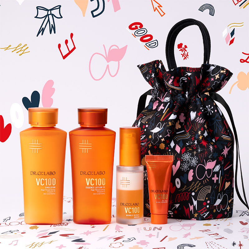 高浸透ビタミンC*¹をマイクロカプセル化することで素早い浸透*²を実現した化粧水(現品)と、高浸透ビタミンC*¹に2種のビタミンC*³をプラスしてうるおいとなめらかさを両立した乳液(現品)の、「VC100」ラインのスキンケアアイテム2点に、とろける温感クレンジング、幅広い分野で活躍するイラストレーター SHOGO SEKINE氏とのコラボレーションによるオリジナル巾着をセット。2025年を頑張った自分へのご褒美、また大切な方へのプレゼントに。