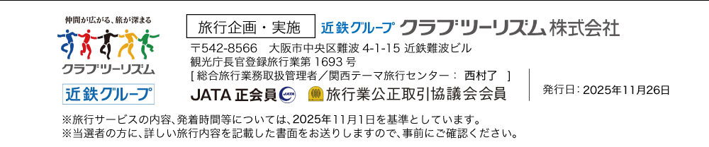 ・当選発表:当選されたお客さまへクラブツーリズム(06-4399-9130)からご予約確認のため、2026年1月5日(月)以降にお電話いたします。