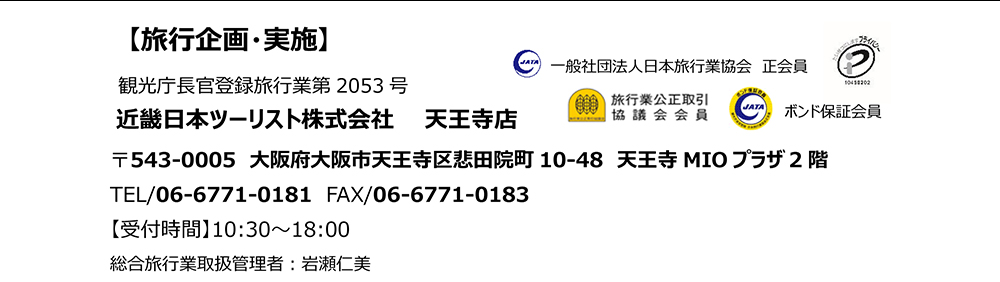 ・入金・チケット等受取場所:あべのハルカス近鉄本店 ウイング館5階「クラブツーリズム」旅行受付カウンター