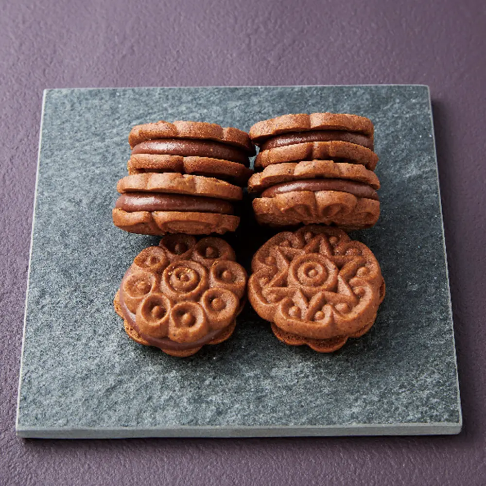 地元食材、伝統、パッケージにもこだわる菓子店。地元の伝統的なジンジャーブレッドにスパイスをブレンドし、ベルギー産ダークチョコとヘーゼルナッツペーストを合わせたクリームをサンド。スパイスの風味とコクのあるクリームが溶けあう上質なスイーツに仕上げています。