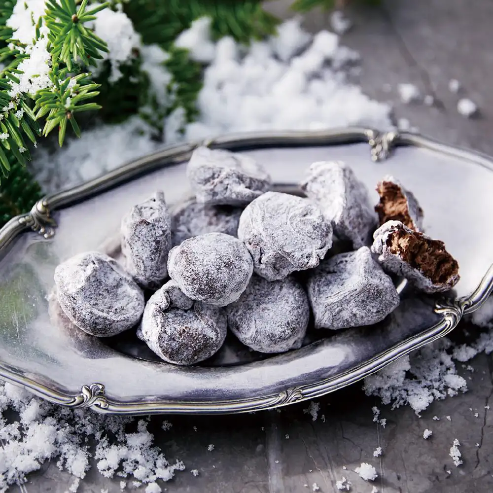 ロワから届く待望の新作は、ナッティーなトリュフタイプのチョコレート。アーモンドとヘーゼルナッツをぜいたくに使った特製プラリネに、ミルクチョコをブレンド。アイシングシュガーで、雪のように美しく。その奥行きのある風味と味わいは、至宝と呼ぶにふさわしい輝きを放っています。