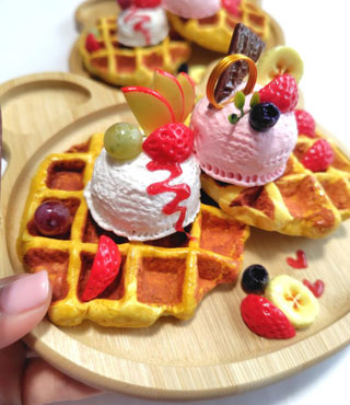 ほぼ実物大の粘土のワッフル土台にアイスを作っていちご等を可愛く飾り付けしてくださいね。メモクリップつきなのでお気に入りの写真など飾ってね。