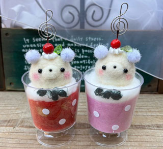 お好きな色の羊毛を混ぜてパフェを作ります。くまちゃんアイスをのせてメモスタンドにします。
