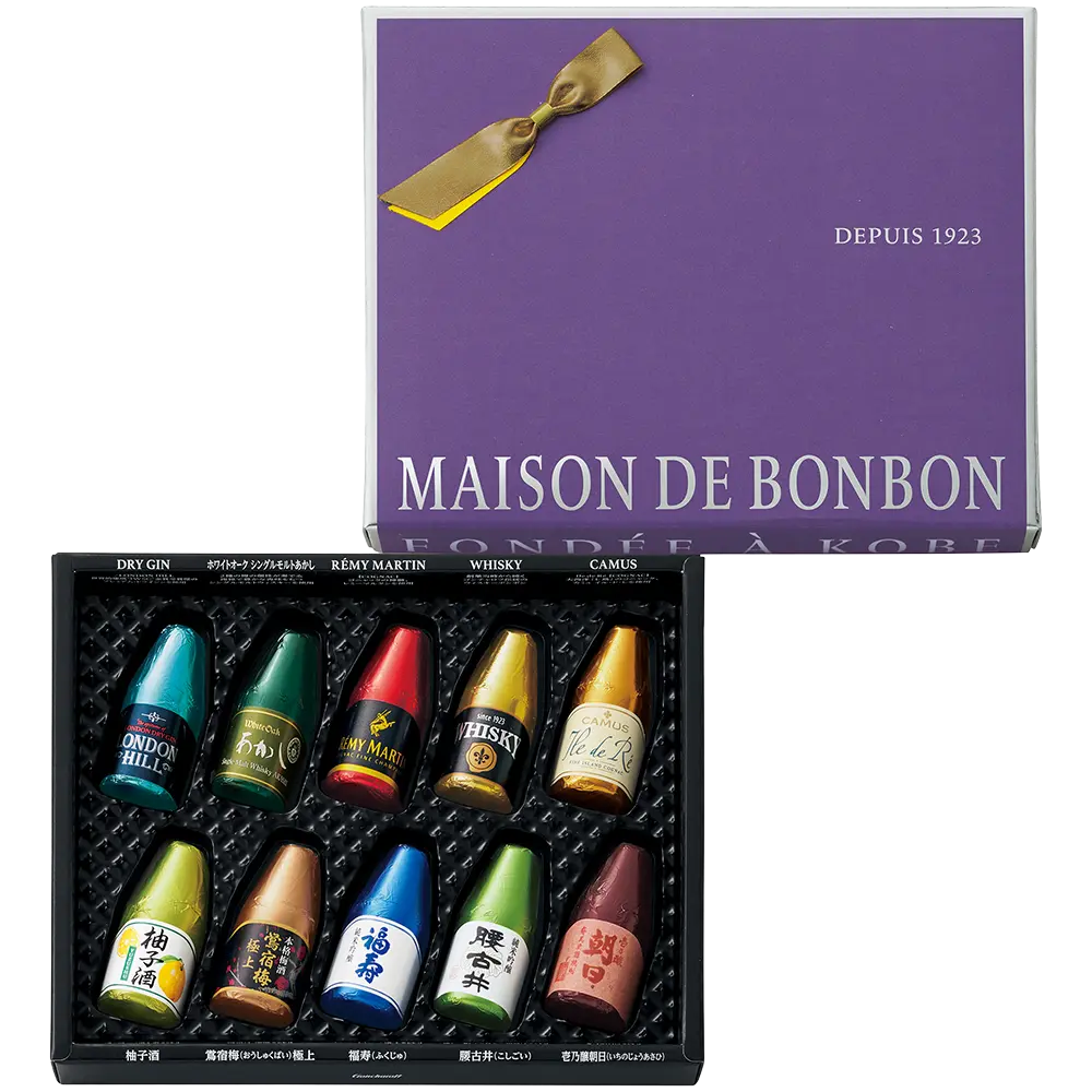 洋酒と和酒10種類のボトル型ボンボンチョコレート。