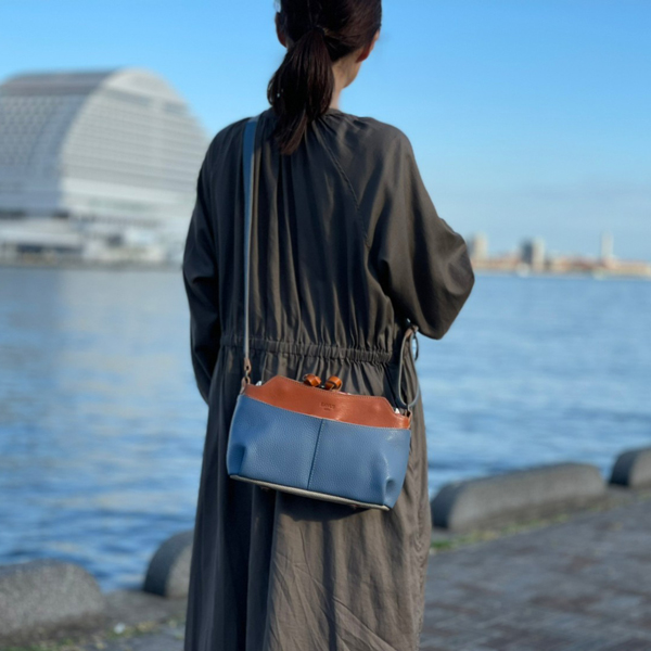 コーティングレザーとタンニンなめしレザーを使い、インテリアファブリックの柄が程よいアクセントになる品の良いミニショルダー。