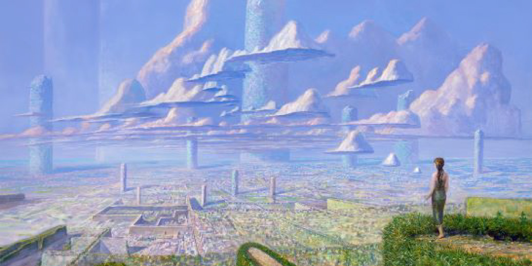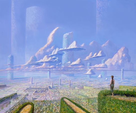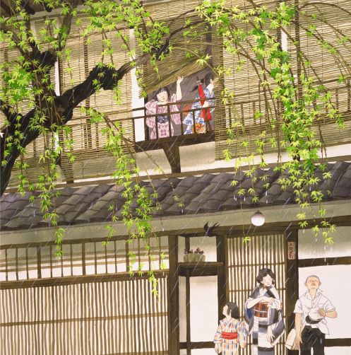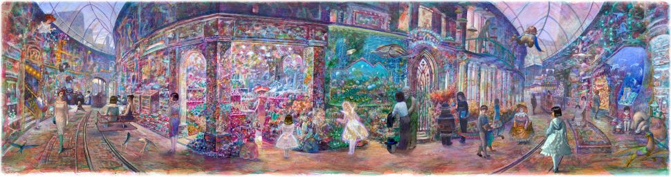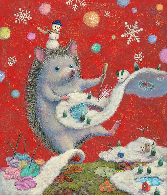井上直久「アーケードの賑わい」手彩©井上直久 井上直久「借景庭園1991」手彩©井上直久 宝永たかこ「森の王国」手彩版画©宝永たかこ 谷口愛「冬をつくろうもの」原画©谷口愛 藤田三歩「梅雨寒の柳」版画©藤田三歩