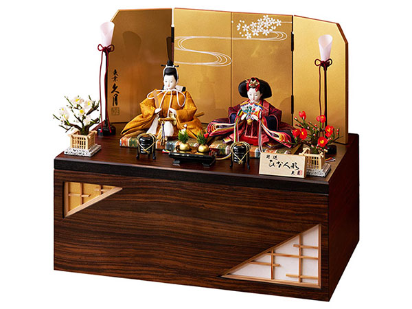 銘木である紫檀を飾り台に使用した、久月オリジナルの銘木シリーズの親王収納飾りです。衣裳の着せ付けは、雛人形師・光園が細部にわたり丁寧に手作業で仕立てました。クラシカルな伝統美とモダンなテイストが調和する、人気のお飾りです。銘木収納飾紫檀 間口50×奥行30×高さ43㎝209,000円