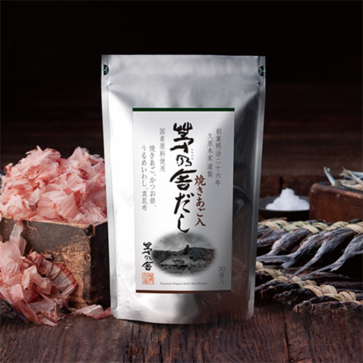 〈茅乃舎〉焼きあご、かつお節、うるめいわし、真昆布などを粉末にしてだしパックに詰めた、本格的な和風だし。味噌汁から煮物まで幅広く使えます。