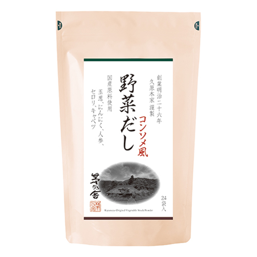 〈茅乃舎〉5種の国産野菜を使用し、野菜の甘み、香りを凝縮させ、深みとコクのあるコンソメ風だしです。