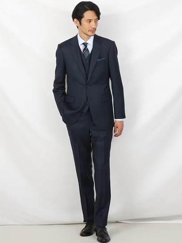 〈タケオキクチ〉タケオキクチオリジナルで開発した生地でウール100%でありながら撥水機能を施したスーツ。