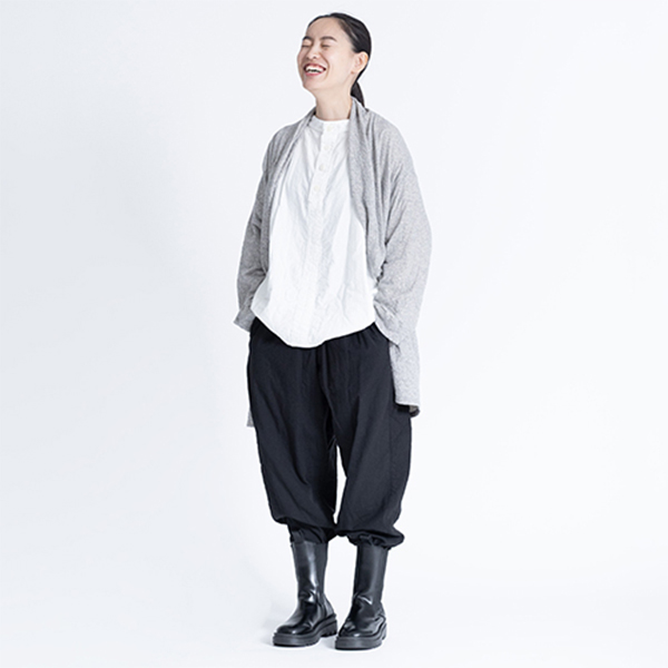 生地は、細い糸をていねいに編んだ二重の天竺ガーゼ。スーピマコットン100%で、しっとりとなめらかな肌ざわり。袖、肩、身幅をゆったりめに仕立てです。パンツのシルエットは、ヒップまわりにゆとりを持たせつつ裾へ向かってすっきりと。身長を問わず、美しいラインで楽しめるバランスを追求しました。杢なめらかロープカーディガン&ガーゼイージーペグパンツ綿100%、Fカーディガン 14,520円パンツ 20,000円