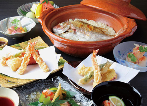 厳選した綿実油と粉を使い、旬の食材をさっくりと軽い衣の天ぷらにお揚げします。名物「鯛めし」は前々日まで、2名さま分からご予約を承ります。